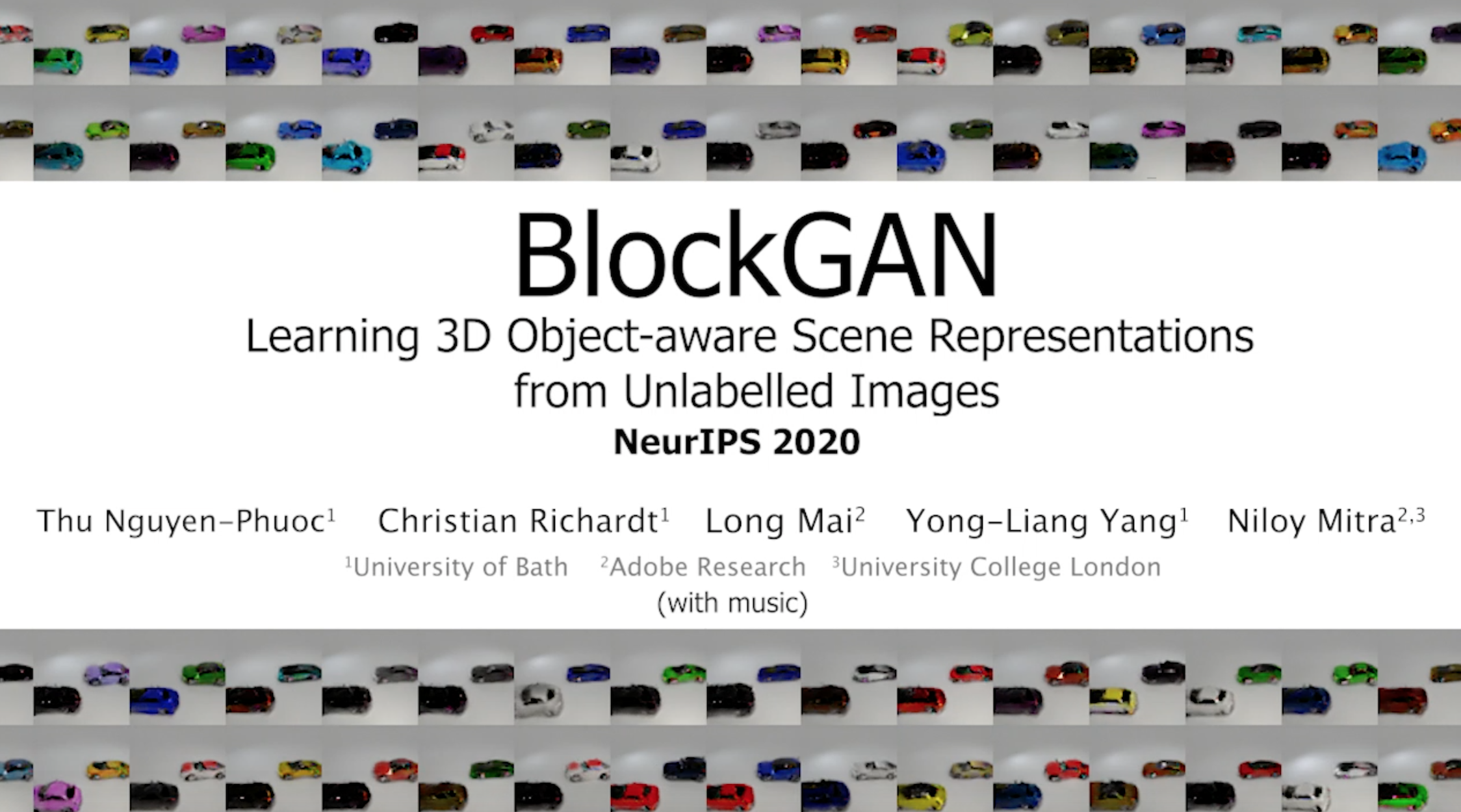 We present BlockGAN, an image generative model that learns object-aware 3D scene representations directly from unlabelled 2D images. Current work on scene representation learning either ignores scene background or treats the whole scene as one object. Meanwhile, work that considers scene compositionality treats scene objects only as image patches or 2D layers with alpha maps. Inspired by the computer graphics pipeline, we design BlockGAN to learn to first generate 3D features of background and foreground objects, then combine them into 3D features for the wholescene, and finally render them into realistic images. This allows BlockGAN to reason over occlusion and interaction between objects’ appearance, such as shadow and lighting, and provides control over each object’s 3D pose and identity, while maintaining image realism. BlockGAN is trained end-to-end, using only unlabelled single images, without the need for 3D geometry, pose labels, object masks, or multiple views of the same scene. Our experiments show that using explicit 3D features to represent objects allows BlockGAN to learn disentangled representations both in terms of objects (foreground and background) and their properties (pose and identity).
